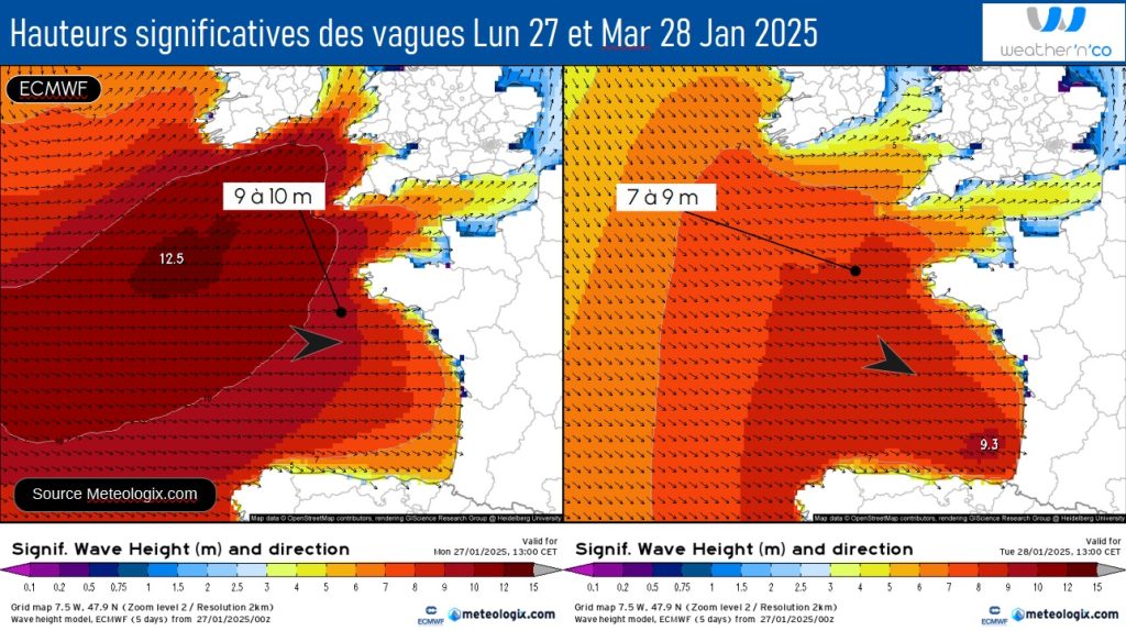 • La houle associée à Herminia va atteindre 7 à 8 mètres au large de Bréhat – Hauteur significative des vagues . Cette houle va se diffuser vers la côte, contribuant à une montée significative du niveau de l’eau, notamment si elle coïncide avec une marée haute.