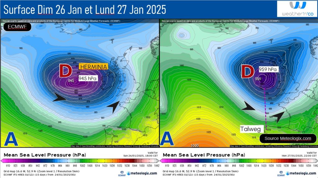 Hier, une dépression très creuse, nommée Herminia, était localisée à l’ouest de l’Irlande avec une pression de 940 hPa. Cette dépression a généré une onde de tempête à grande échelle, qui s’est propagée en direction de la Manche. Voici comment ce phénomène s’est amplifié :
