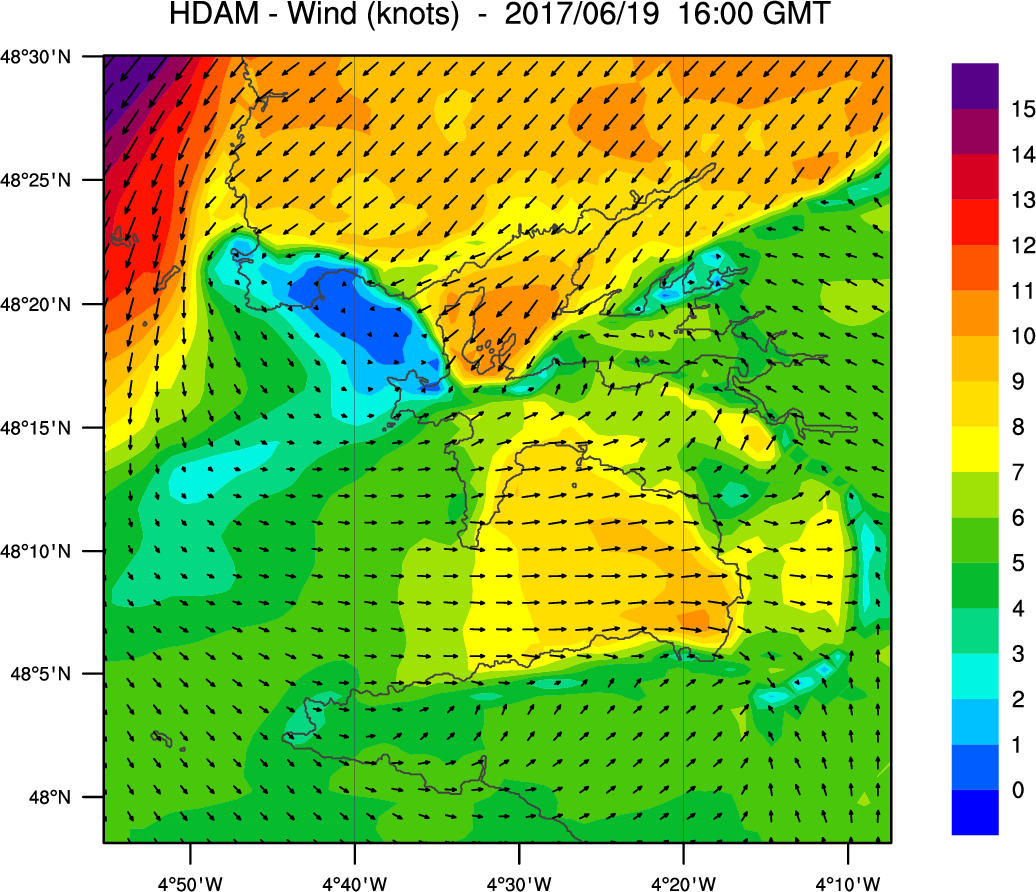 Illustration : Quand la brise de nord-est s'invite en rade de Brest - Modélisation à 1 km de résolution.